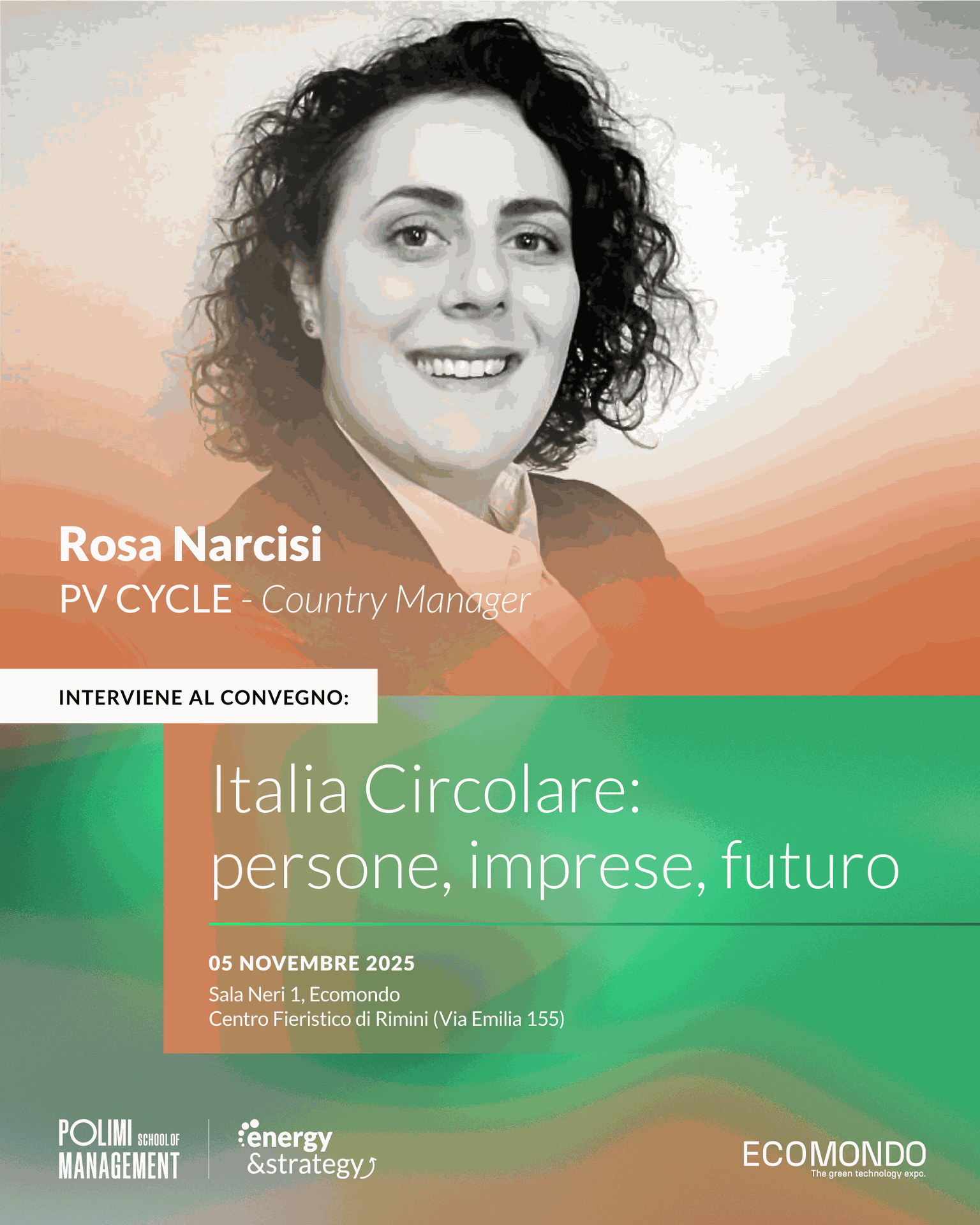 Il 5 novembre, Rosa Narcisi, Country Manager di PV CYCLE ITALIA, interverrà al Convegno Italia Circolare: persone, imprese, futuro organizzato da Energy & Strategy - POLIMI School of Management, in qualità di Partner della ricerca dell’Osservatorio Circular Economy 2025.